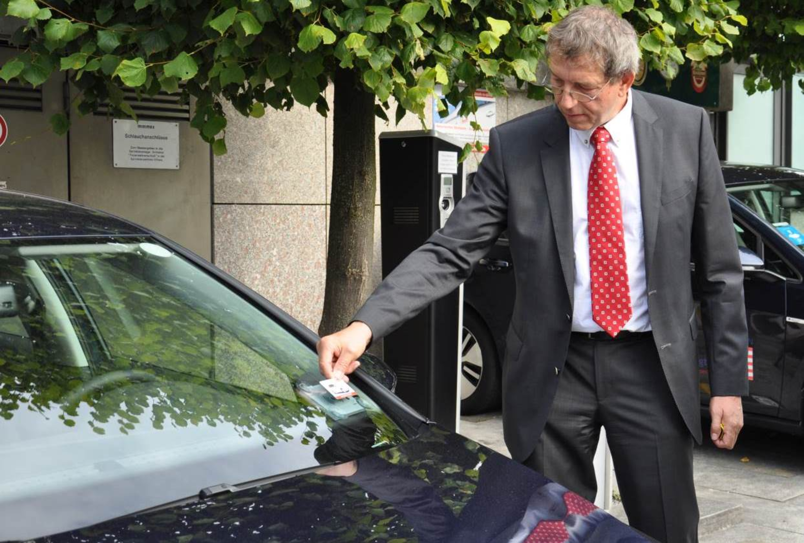 Bitte stecken Sie den Schlüssel mit dem runden Anhänger zurück in die Halterung im Handschuhfach, schließen alle Türen und halten die Karte von außen vor das Lesegerät hinter der Windschutzscheibe. Ein Klacken der Zentralverriegelung und die rote Leuchtdiode des Lesegerätes zeigen Ihnen an, dass das Auto wieder verschlossen ist.