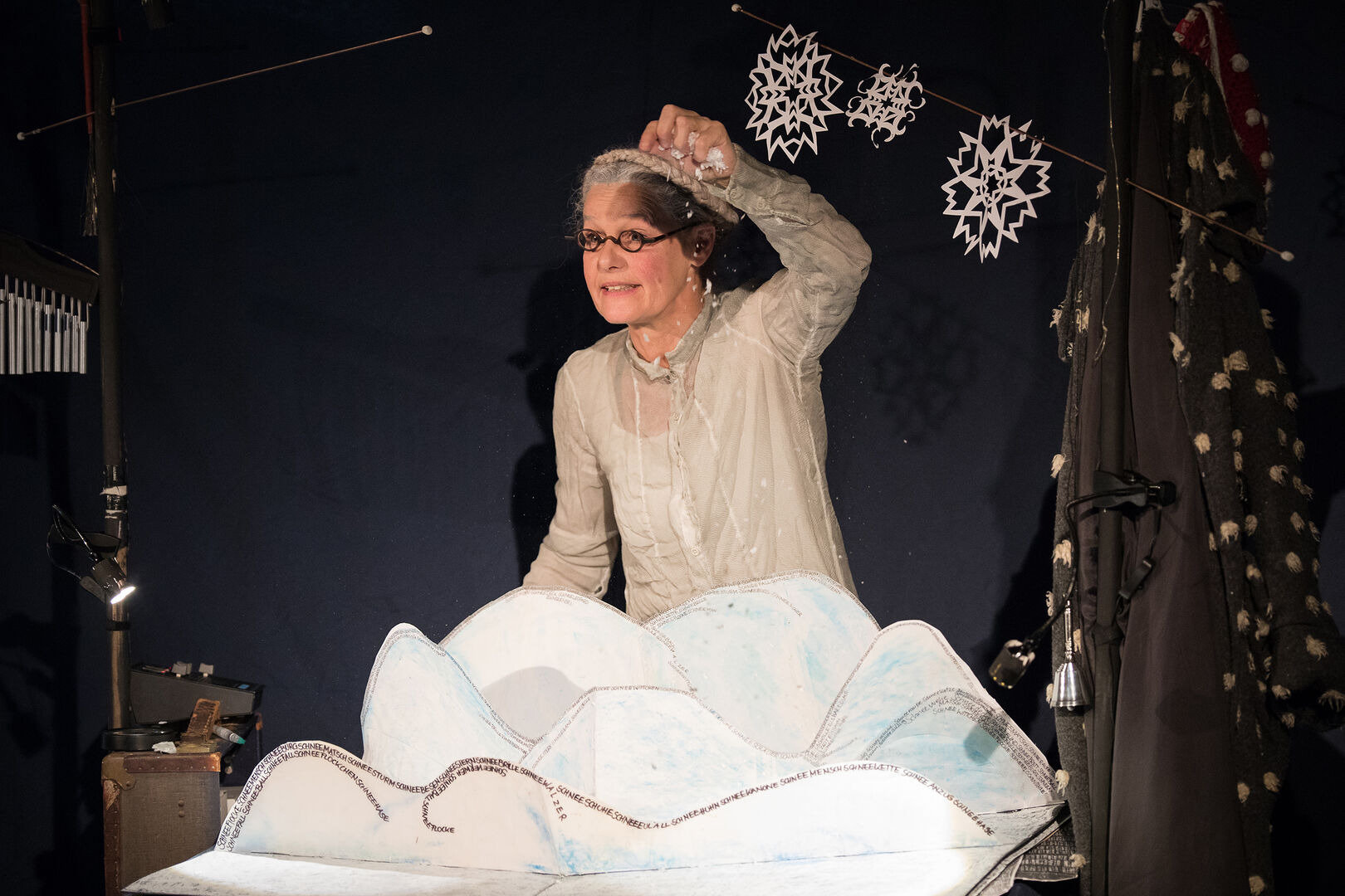 Eine kleine Figurentheaterbühne mit einem Häuschen. Eine Schauspielerin hält eine Rentierfigur in der linken Hand. | © Theater Vagabündel, Ute WangeEine kleine Figurentheaterbühne mit einem Häuschen. Eine Schauspielerin hält eine Rentierfigur in der linken Hand. | © Theater Vagabündel, Ute WangeEine Schauspielerin vor schwarzem Hintergrund lässt aus ihrer linken Hand Kunstschnee auf eine kleine Schneelandschaft rieseln | © Theater Vagabündel, Ute WangeEine Schauspielerin vor schwarzem Hintergrund lässt aus ihrer linken Hand Kunstschnee auf eine kleine Schneelandschaft rieseln | © Theater Vagabündel, Ute Wange