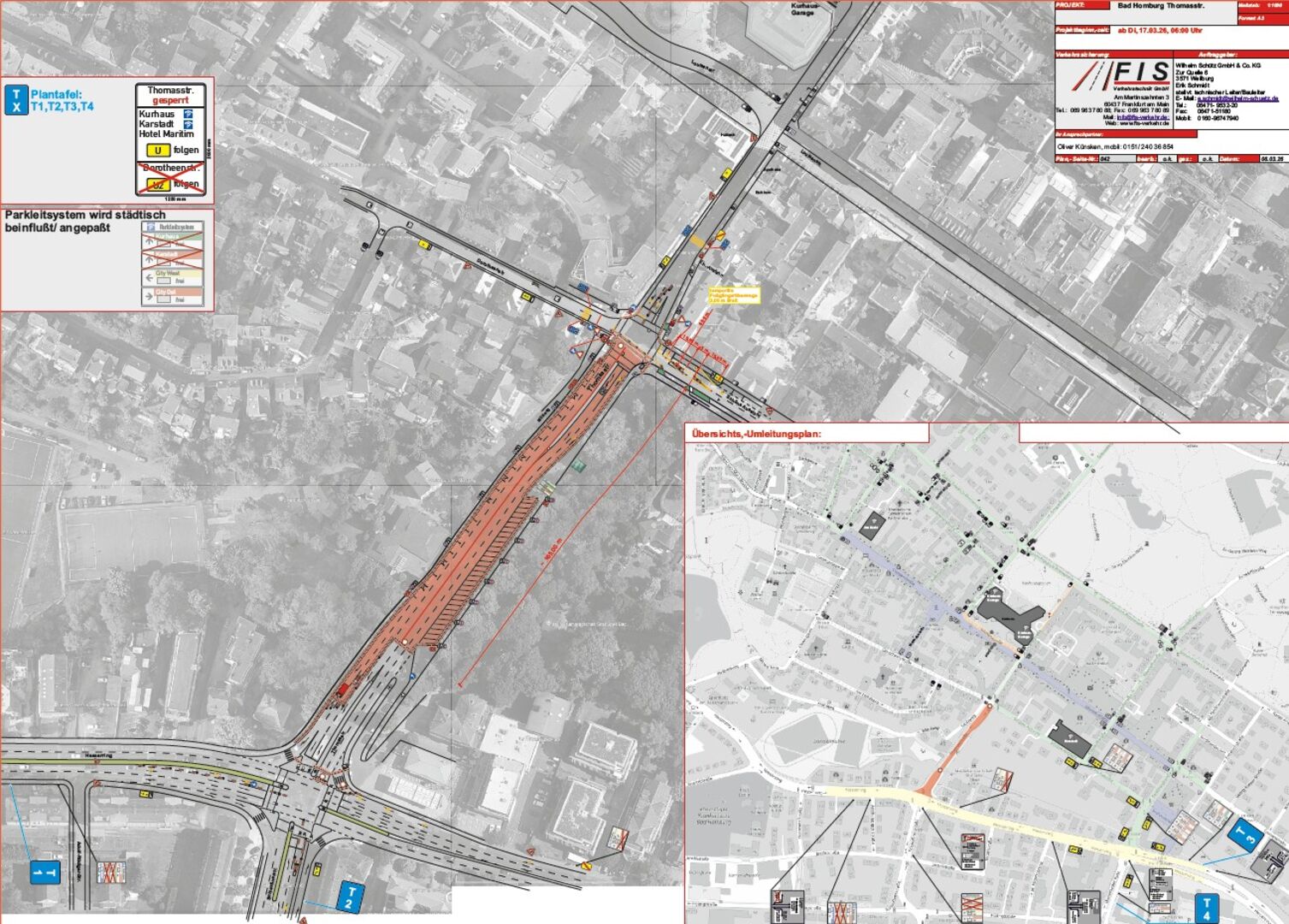Bad Homburg v. d. Höhe. Die Stadt saniert ab Dienstag, 17. März 2026, die Fahrbahn der Thomasstraße im Bereich der Thomasbrücke zwischen Schöne Aussicht und Hessenring. Die Arbeiten erfolgen in mehreren Bauabschnitten und dauern voraussichtlich bis 17. April 2026.