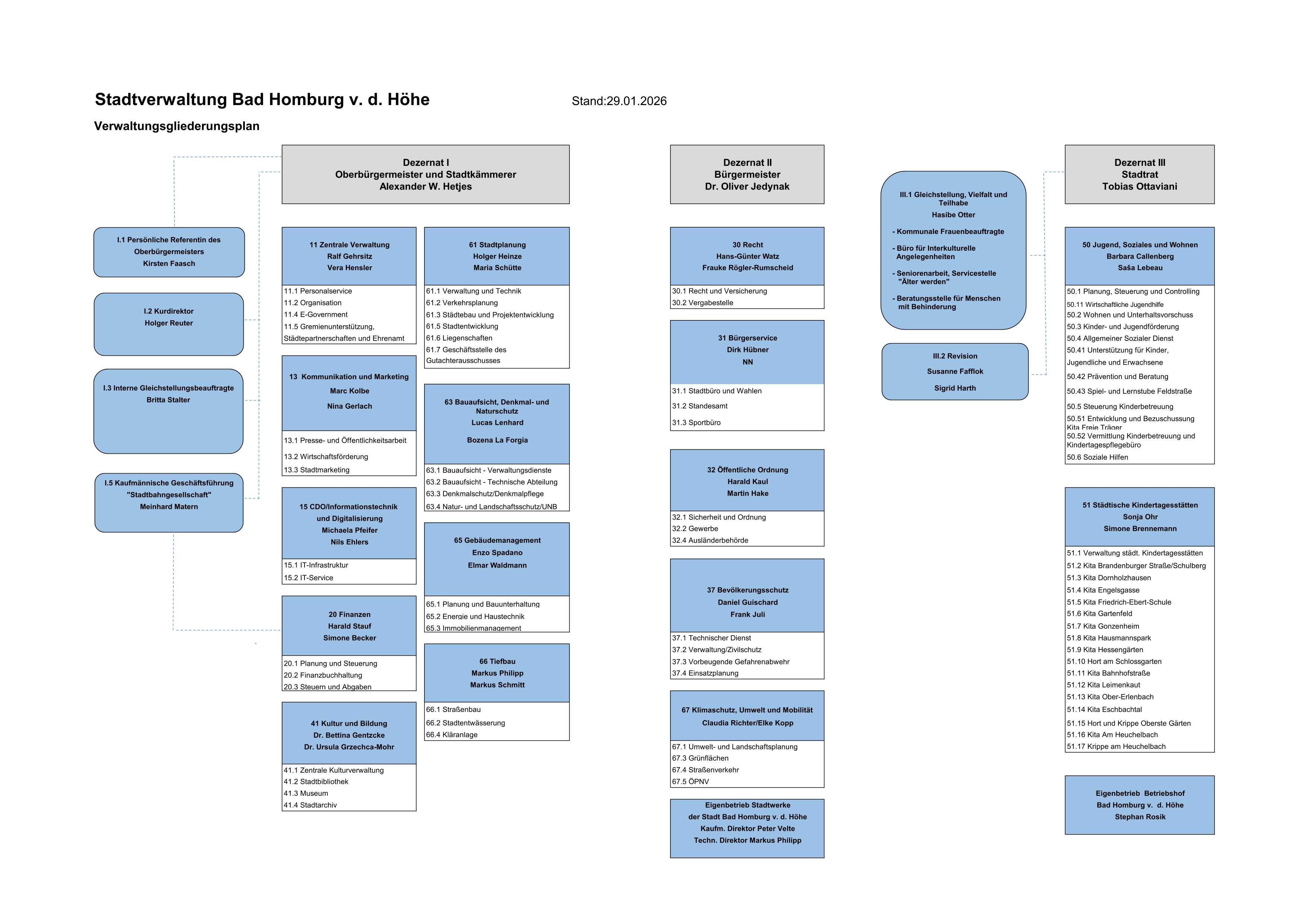 Übersicht der Dezernate, der zugehörigen Dezernenten, Fachbereiche, Fachdienste und Produktbereiche.